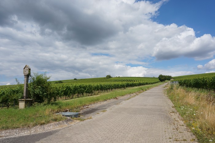 Následně by bylo možné si cestu trochu zkrátit po lokálních cestách, ale nakonec volíme originální variantu po Main Radweg. A děláme dobře, protože projíždíme ostrovem vína, který je tvořený meandrem řeky a umělým kanálem Mohanu. Kraji dominuje vinohradnictví a v Nordheimu je jedno vinařství vedle druhého. Bohužel to máme ještě hrozně daleko. Podél kanálu přijedeme následně do Volkachu, který je jedním z center vinařské oblasti Frank a tady už neodoláme a na tržišti s kašnou si zajdeme na skleničku typické francké odrůdy - Sylvánského zeleného.