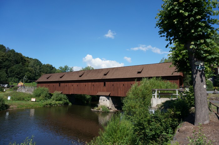 V lázeňském městečku Bad Berneck zajíždíme až do centra, ale i v lázních hospody zavírají ve dvě hodiny a tak máme asi pětiminutovou smůlu. Za městem začíná poslední úsek naší cesty k pramenům Mohanu – desetikilometrová cyklostezka po zrušené železnici. Tentokrát samozřejmě opět nahoru. Sklon kolísá mezi 2 a 3 % a s těžkými brašnami, ke konci dne, to je docela těžké a únavné. Na konci železnice není kupodivu nádraží, ale otevřená hospoda a tak si můžeme před závěrečným stoupáním udělat přestávku.